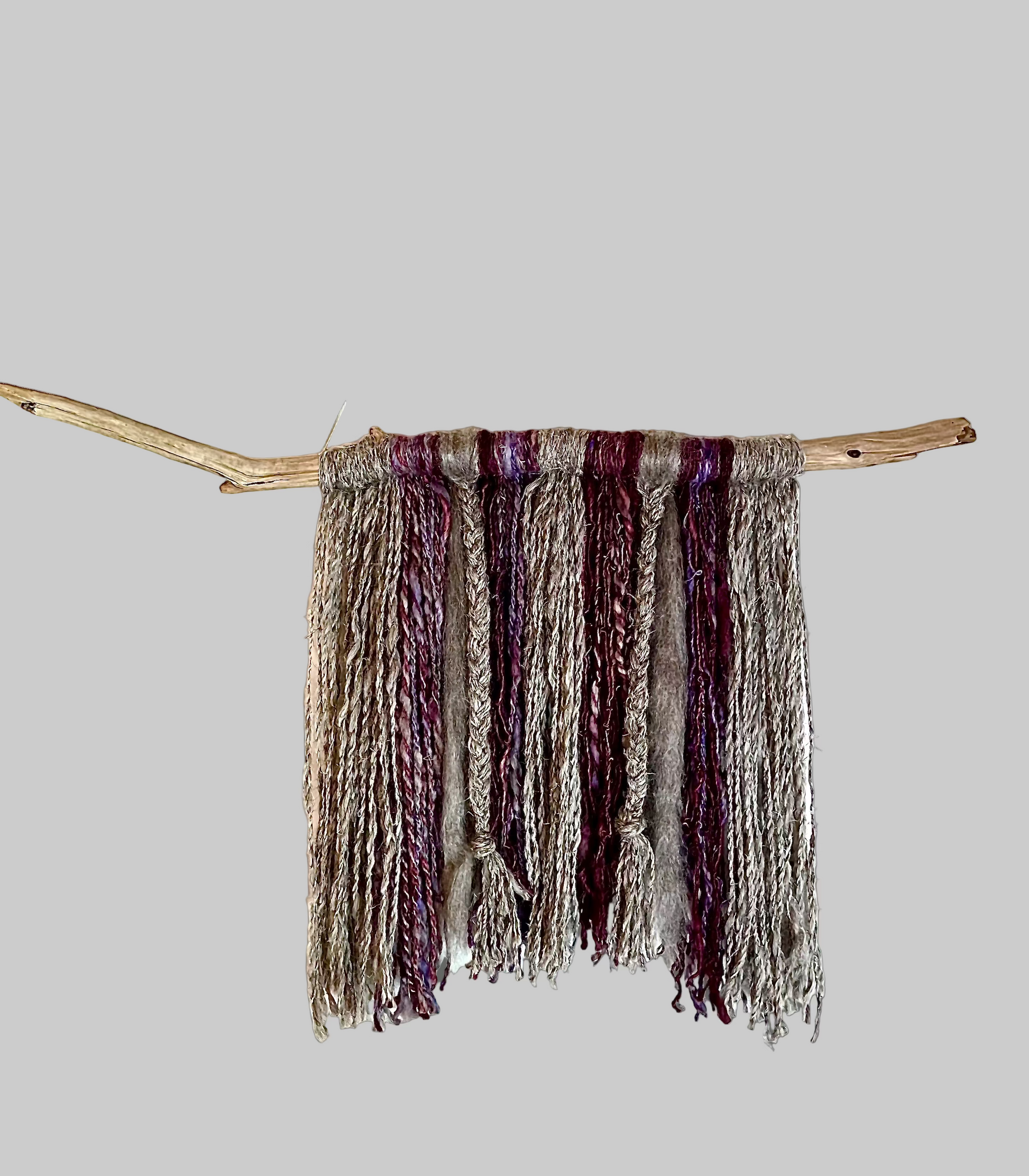 Wall Hanging made with hand-spun wool. Holder made from Maine driftwood.